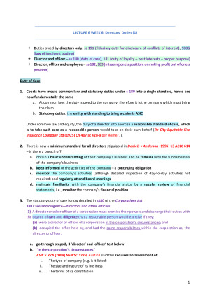 These are comprehensive, color coded notes for all examinable content on the final exam. All cases (including detailed summaries) and statutory provisions learnt are included. Important takeaway from the cases & ratio decidendi all highlighted. It is a helpful summary of all readings set for the course, definitely memorizable for exams. These notes provide a step-by-step structure for how to answer a problem question for each week's content on the final exam (see my other listing for essay question notes). Topics included: Directors' Duties (1), (2) and (3) Minority Protection Shares and Capital Transaction Public Issues, Debt and Charges External Administration - Winding up, receivership and voluntary administration The structure is set out very clearly and I have received feedback that the notes are extremely helpful for exam preparation!