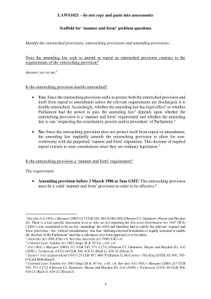 This set of scaffolds is structured to allow you to achieve a high distinction for any problem question that may arise in public law. They include the latest developments in the law as of early 2022. Features include: - Comprehensive distillation of all key and subsidiary principles from the relevant case law and legislation listed on the reading guide - For topics 1-5 (which is assessed through an assignment): AGLC4 compliant footnotes with pinpoint citations for each and every legal proposition - For topics 6-9 (which is assessed through a short-release exam): multi-level bookmarks and a hyperlinked overview of the course for efficient navigation Using these scaffolds, I achieved a high distinction (90) and first place for the unit of study in semester 2 2021. All topics in public law are covered (see list below) but note that certain content from some topics which cannot be assessed in a problem question is not covered. - Key themes in Australian public law - Constitutional history: colonial origins and steps to independence - Constitutional change - 'The people' and the constitution - A representative parliament - A responsible executive - Non-statutory executive powers - Oversight of the Executive - Chapter III safeguards for judicial power