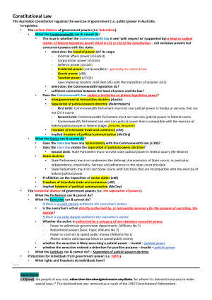 This note served me well in the final exam and got me a H1. This note is structured to help tackle the Week1-4 interim assessment (focusing on the understanding of different judgements and the distinguishments between the analytical methods & arguments of different judges) and the Week5-12 final exam questions. At the same time, it covers all of the topics discussed in the readings, textbook, pre-class recordings and tutorials no matter how trival the topics are. I believe that the most important point for scoring high marks in this subject is to quickly spot issues based on different facts. So, this note provides a systematic organization of the principles of the different cases and the nuances between the facts to which they apply. Please do not read this note mechanically, but try to use it skillfully in specific hypos. Covered Topics: 1 The vertical division of government powers (ie federalism). 1-1 What the Commonwealth can & cannot do? 1-1-1 The issue is whether the Commonwealth law is one ‘with respect to’ (supported by) a head or subject matter of federal legislative power listed in s51 or s52 of the Constitution. - not exclusive powers but concurrent powers with the states • what does the head of power do? its scope - External affairs power (s51(xxix)) - Corporations power (s51(xx)) - Defence power (s51(vi)) - Incidental power (ss51(xxxix)&61) - generally no coercive law - Grants power (s96) - Taxation power (s51(ii)) Laws imposing taxation shall deal only with the imposition of taxation (s55) • what does the Commonwealth legislation do? • sufficient connection between the head of power and the law? 1-1-2 Does the Commonwealth law violate a limitation on federal legislative power? • Intergovernmental Immunities doctrine (Austin) • Separation of judicial powers doctrine (Boilermakers) - First Limb: Commonwealth Parliament must not vest judicial power in bodies or persons that are not Ch III courts - Second Limb: Commonwealth Parliament must not vest non-judicial power in federal courts - Commonwealth Parliament can vest non-judicial power that is compatible with the exercise of federal judicial power in federal judges persona designate • Freedom of interstate trade and commerce (s92) • Implied freedom of political communication (McCloy) 1-2 What the States can & cannot do? • Does the state law have any inconsistency with the Commonwealth law (s109)? • Does the state law violate the separation of judicial powers doctrine? - Second Limb: State Parliament must not vest state judicial power in federal courts (Re Wakim) • Kable doctrine - State Parliaments must not undermine the defining characteristics of State courts, in particular, independence, impartiality, fairness and adherence to the open-court principle - State Parliaments must not vest State courts with functions that are incompatible with the exercise of federal judicial power • Prohibition on the imposition of excise duties (s90) • Freedom of interstate trade and commerce (s92) • Implied freedom of political communication (McCloy) 2 The horizontal division of government powers ( the separation of powers). 2-1 What the Parliament can & cannot do? 2-2 What the Executive can & cannot do? If there is a valid statute authorize the executive’s action: • Is the executive’s action directly authorised by, or reasonably necessary for the purpose of executing, the statute? If there is no valid statute authorize the executive’s action: • Whether the action is authorised by a category of non-statutory executive power. - Power to administer government departments (Williams No 1) - Nationhood power (Davis; Pape; Williams No 2) - Power to contract & spend public money (Williams No 1) Always need a valid appropriation to spend public money • whether the executive is likely exercising a judicial power – invalid – judicial power • whether the executive ordered a detention for punitive purpose – invalid – judicial power 2-3 What the Judiciary can & cannot do? – Separation of judicial powers doctrine 3 Protections for individuals from government power (ie rights). • What rights and freedoms do individuals have?