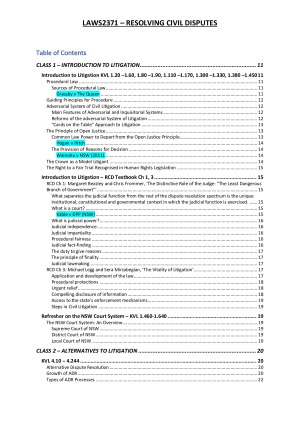 This is a FULL SET of resolving civil disputes notes from trimester 1 2021. This course uses 2 seperate textbooks which i have used to create this incredible set of full course notes. These RCD notes follow the order in which classes are taught: - Class 1 - Introduction to litigation - Class 2 - Alternatives to litigation - Class 3 - Mediation in practice - Class 4 - Arbitration - Class 5 - Legal technology during the pandemic and online dispute resolution - Class 6 - Court annexed mediation, enforceability of ADR clauses, settlement negotiation privilege - Class 7 - Case management - Class 8 - Costs - Class 9 - Security for costs and funding litigation - Class 10 - Limitation periods, freezing and search orders - Class 11 - Pleadings - Class 12 - Standing, res judicata and anshun estoppel, causes of action and parties, class actions - Class 13 - Client privilege - Class 14 - Service - Class 15 - Discovery, discovery and technology, implied undertaking - Class 16 - Subpoenas, witness preparation and affidavits - Class 17 - Summary disposal, appeal, enforcement and execution of judgement