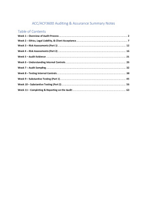 These Auditing & Assurance notes are thorough and detail what you need to know for each topic. They include original and creative diagrams, graphs, tables, and examples to assist your understanding. Topics listed: -W1: Overview of Audit Process -W2: Ethics, Legal Liability, & Client Acceptance -W3: Risk Assessments (Part 1) -W4: Risk Assessments (Part 2) -W5: Audit Evidence -W6: Understanding Internal Controls -W7: Audit Sampling -W8: Testing Internal Controls -W9: Substantive Testing (Part 1) -W10: Substantive Testing (Part 2) -W11: Completing & Reporting on the Audit These notes are suitable for studying throughout the semester and for preparation leading up to the final exam :)