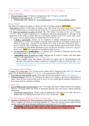 BENEFITS OF MY NOTES - These notes provide you with order and structure in how you approach problem questions. - You can just copy-paste the notes into your responses (or do some minor re-tweaking) and then apply your facts in sections that are highlighted. It really makes it that simple. - I have provided PINPOINTS as well having completed the readings and this will give you bonus marks in achieving that HD. - I promise you that these notes will the best set of notes that you will ever receive. I spent hundreds of hours perfecting these notes into these notes. MY GUARANTEE - This is what makes these sets of notes well worth the investment. Once you buy it I promise you that you will understand. LEGEND - Light Blue = Key principles - Pink = Case Names - Dark Blue = Legislation - Red / Bold = Anything Key to Note TOPICS Topic 2 — Sources of International Law Topic 3 — The Law of Treaties Topic 4 — International Law and Domestic Law (DL) Topic 5 - International Legal Personality, Statehood and Self-Determination Topic 6 - Title to Territory Topic 7 - State Jurisdiction Topic 8 & 9 — Immunity from Jurisdiction Topic 10 — State Responsibility I Topic 11 — State Responsibility II Topic 12 — Use of Force Topic 13 — Implementation, Enforcement and Accountability