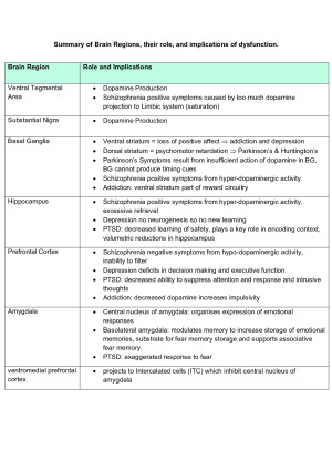 notes include: -extrapolated, detailed, written explanations of lecture and tutorial content -tables displaying summary of brain regions, their role, and implications of dysfunction; and summary of Brain Conditions/Neural Implications/Symptoms/Implications. Week 1: Parkinson’s Disease Week 2: Schizophrenia Week 3: Depression Week 4: PTSD Week 5: Addiction Week 6: Alzheimer’s Disease Week 7: Mimicry & Synchrony Week 8: Underlying Mechanisms of Mimicry Week 10: Underlying Mechanisms of Synchrony Week 11: Social Benefits of Interpersonal Coordination Week 12: Expertise and Interpersonal Coordination Week 13: Mental Disorders and Interpersonal Coordination