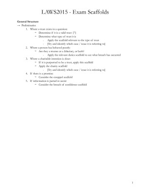 A comprehensive and succinct scaffold to approach problem questions for all topics for Equity Law. I used this scaffold to achieve a Distinction in the final exam and receive a Distinction overall for the Course. These notes provide the key principles for each topic and outline an effective structure for addressing problem questions. The notes contain scaffolds for all material topics including: - Breach of Confidence - Estoppel - Remedial Equity - Nature and Construction of Trusts (ie. determining whether a trust exists and its substance) - Express Trusts (ie. applying the rights, duties and powers under a trust) - Resulting Trusts - Constructive Trusts - Fiduciary Obligations - Tracing - Charity