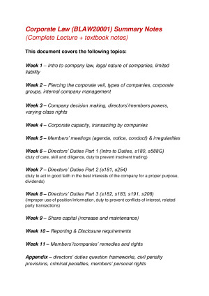 Complete and very comprehensive H1 Corporate Law Summary Notes! Summarises the lecture notes as well as relevant parts of the textbook, with case summaries and exam tips included. Contains everything you need to know for the course! This document covers all topics from weeks 1-12, with the appendix containing resources to help with the exam and skeleton frameworks to answer hypothetical questions. Download a copy to ace Corp Law!