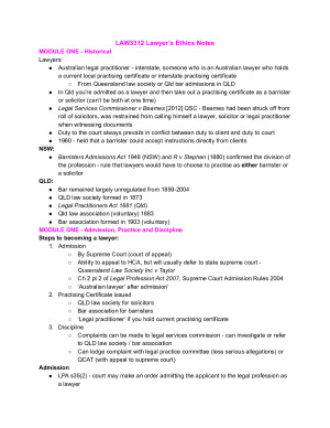 These notes were created from the lectures in this course and include the following modules: MODULE ONE - Historical MODULE ONE - Admission, Practice and Discipline MODULE TWO – Regulation and Discipline MODULE THREE: Litigation and Advocacy Ethics MODULE FOUR – Relations with other Lawyers MODULE FIVE: Moral Frameworks of Legal Practice MODULE SIX: Engagement and Fees Competence and Care Conflicting Loyalties Client Money