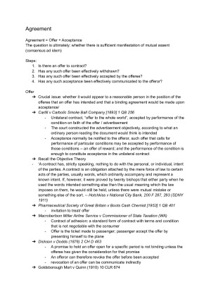 The most comprehensive notes including all the key takeaways of cases and readings So easy to follow during class and exams. All key points are highlighted and well organized by topics. Basically you don't have to do any reading with this notes in hand, and can get at least Distinction in the Final Exam. I achieved an overall High Distinction (87%) in Contracts using these notes - they are the BEST scaffold that includes every important legislation and quote, SUPER USEFUL for exams. All topics including: • Agreement • Consideration • Certainty • Intention to Create Legal Relations • Formalities • Estoppel • Terms • Construction • Exclusion Clauses • Privity of Contract • Discharge by Performance • Discharge by Agreement • Termination for Failure of a Contingent Condition • Termination by Breach • Discharge for Delay • Discharge by Repudiation • Discharge by Frustration • Process and Effects of Termination