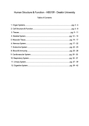 HBS109 Human Structure & Function - Deakin University - Complete Unit Notes (HD) Includes Notes from Each Week of Lectures to Cover the Entire Unit I Recently Graduated My Bachelor of Biomedical Science at Deakin University with Distinction Using These Notes. 1. Organ Systems 2. Cell Structure & Function 3. Tissues 4. Skeletal System 5. Muscular Tissue 6. Nervous System 7. Endocrine System 8. Blood & Immunity 9. Cardiovascular System 10. Respiratory System 11. Urinary System 12. Digestive System Perfect To Complement Your Own Notes or As an Exam Revision Tool