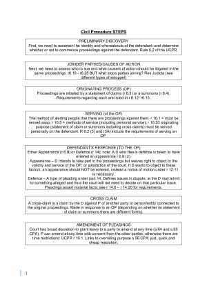These final exam notes cover all lectures/seminars/readings for Civil Procedure. The first two pages of the notes comprise of a concise flow chart with relevant rules (including references to the legislation) and alternatives/exceptions to those rules. The following 26 pages include a further detailed and comprehensive breakdown of each element of Civil Procedure including excerpts from the legislation where appropriate for ease of reference and understanding. The following topics are covered: 1. Preliminary Discovery 2. Joinder Parties 3. Causes of Action 4. Originating Process 5. Serving of the Origination Process 6. Defendant's Response 7. Cross Claims 8. Amendment of Pleadings 9. Discovery 10. Interrogatories 11. Summary Disposal for the Plaintiff 12. Summary Disposal for the Defendant