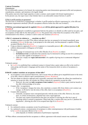 This note is designed to be extremely concise and easily-extractable for exam use. It is construed in hypo format. It requires basic knowledge and fact of cases, as only the ratio/relevant rules are provided. Topics included: 1. Contract Formation - Offer & Acceptance - Consideration - Certainty - Intention - Formalities - Capacity - Privity 2. Misleading and Deceptive Conduct 3. Estoppel 4. Restitution