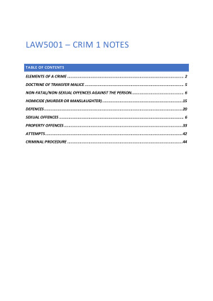 Took this subject in T3, 2021, relied on these notes solely and includes everything you need for the final exam! Summarises all the lecture slides/textbook readings/other notes and sources Topics Covered: ELEMENTS OF A CRIME DOCTRINE OF TRANSFER MALICE NON-FATAL/NON-SEXUAL OFFENCES AGAINST THE PERSON HOMICIDE (MURDER OR MANSLAUGHTER) DEFENCES SEXUAL OFFENCES PROPERTY OFFENCES ATTEMPTS CRIMINAL PROCEDURE