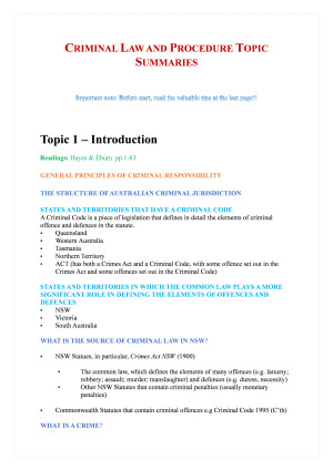The best LPAB CRIMINAL LAW AND PROCEDURE summary that you will find!! Very organised and updated notes. Used for the Mar 22 exam. Subject successfully completed!! Perfect for preparing for your exam. You don't have to check any other material! Very complete notes!! Contains extra study tips on the last page!! (If you are starting to take LPAB subjects you must read these tips first!!!) Read it now and start getting organised and getting ready to pass the exam!! Topic 1 – Introduction Topic 2 – Property Offences Topic 3 – Assault Topic 4 – Sexual Offences Topic 5 – Conduct of Homicide Topic 6 – The Minds of Murder Topic 7 – The Minds of Involuntary Manslaughter Topic 8 – Provocation Topic 9 – Self Defence Topic 10 – Duress Topic 11 – Necessity Topic 12 – Insanity and Diminished Responsibility Topic 13 – Automatism Topic 14 - Intoxication Topic 15 – Strict Liability and Mistake of Fact (Statutory Criminal Offences) Topic 16 – Complicity Topic 17 – Attempt Topic 18 – Aspects of Criminal Procedure in NSW