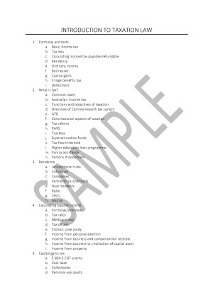 Super comprehensive notes for Intro to Tax Law. This is a law subject so knowing cases and legislation and being able to answer problem questions in a legal style is extremely important!! - Notes and concepts with case and/or legislation references - Formula and 'tests' at the beginning for reference Topics include: - Basic income tax - Tax loss - Calculating income tax payable/refundable - Residency - Ordinary income - Businesses - Capital gains - Fringe benefits tax - Deductions - ATO - Constitutional basis of taxation