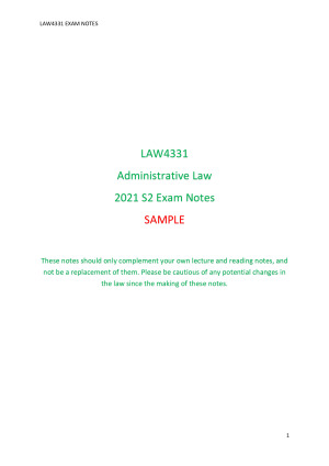 These are the notes that got me an HD in the LAW4331 Administrative Law Exam in S2 2021! It has been kept simple and concise, with summaries of relevant case facts and outcomes in each topic. Feel free to see the sample document for more. The topics covered are: 1. Jurisdiction 2. Standing 3. Reasons 4. Grounds for Judicial Review -> Acting Outside of Power -> Abuse of Power/Discretion -> Fact-Finding Error -> Failure to Exercise Discretion -> Procedural Fairness 5. Jurisdictional Error 6. Privative Clauses 7. Remedies 8. Merits Review
