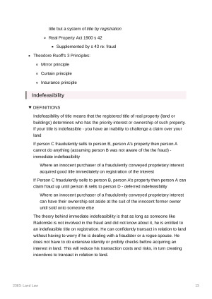 DISTINCTION LAND LAW NOTES Made in NOTION so set out really neatly with super structured toggles and headings had UNSW's legend lecturer Cathy Sherry so everything is explained super plainly and easy to understand Includes: - Native Title - Torrens Introduction - Indefeasibility - Fraud and s 56C - Volunteers, short term leases, in personam exception - Overriding statutes - Caveats and competing equitable interests - Co-Ownership - Leases (leasing fundamentals, substantive requirements, covenants) - Leases (multiple sources of rights, assignment) - Leases (remedies, leases as contracts) - Mortgages - Easements - Freehold Covenants Covers all Moodle Readings + lectures + videos + Land Law textbook