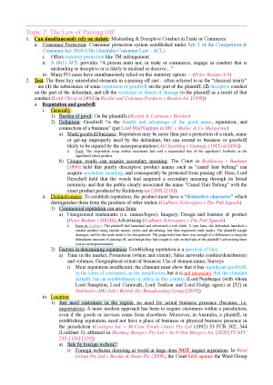 BENEFITS OF MY NOTES - These notes provide you with order and structure in how you approach problem questions. - I have provided PINPOINTS as well having completed the readings and this will give you bonus marks in achieving that HD. - I promise you that these notes will the best set of notes that you will receive. I spent many hours perfecting these notes into these notes. - These are the scaffold version if you do not want the super detailed version. MY GUARANTEE - This is what makes these sets of notes well worth the investment. Once you buy it I promise you that you will understand. LEGEND - Light Blue = Key principles - Pink = Case Names - Dark Blue = Legislation - Red / Bold = Anything Key to Note TOPICS - Introduction - Passing Off - Trademarks - Patents It covers all subtopics covered in the course for these topics