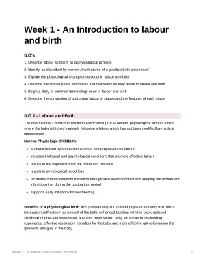 PREVIOUSLY HNM102 PARTNERSHIPS IN MIDWIFERY CARE 2, NOW HNM210 PARTNERSHIPS IN MIDWIFERY - LABOUR AND BIRTH CARE (2022) Weekly notes organised by Intended Learning Outcomes. - Week 1: An Introduction to Labour and Birth - Week 2: The First Stage of Labour - Week 3: Working with Pain during labour / The intrapartum CTG - Week 4: Quality and Safe Intrapartum Care / Vaginal Examinations / Mechanism of an OA Birth - Week 5: The Second Stage of Labour - Week 6: The Third Stage of Labour & Post Partum Haemorrhage - Week 7: Neonatal Transition and Immediate Maternal Care Comprehensive notes using multiple resources (textbook, content, videos and online resources/research) Please note: Images and diagrams have been removed. A description of the diagram has been added in their place so that you can find a similar diagram easily online or through your textbook.