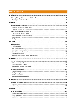 Detailed and thorough notes on the entire course content for Fedcon at UNSW. Detailed dissection of each significant case with the correct principles highlighted and stated in RED. Excellent table summaries for multiple topics highlighting the current authoritative statement of law - excellent for problem questions. Topics: - Statutory Interpretation and Constitutional Law - Constitutional Interpretation - Federalism and Engineers Case - Characterisation - External Affairs Power - Trade and Commerce Power - Corporations Power - Taxation and Grants Power - Races Power - Defence Power - Inconsistency between Commonwealth and State Laws - Freedom of Interstate Trade and Commerce - Judicial and Non-Judicial Detention - IFOPC - Melbourne Corporation Principle