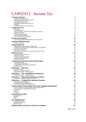 These notes provide you with order and structure in how you approach problem questions. These are the best tax notes you will find, as it is summarises everything in just around 60 pages and has everything you will need in the course. It is concise, precise yet has enough detail that you won't be missing any information. I read all the cases, watched the lectures and combined tutorial notes in order to create these comprehensive set of notes. I then refined it multiple times to cut down to the key information that you would need in order to walk into an exam. Once you get the document, you will understand. ✓ Succinct information ✓ Comprehensive ✓ Colour-coded for easy reading Get these notes now and help yourself in tax law :) Notes are also colour coded so that you can easily determine what is relevant. Light blue = key principle Pink = Cases Dark blue = legislation Red / bold = anything super key to point out Topics: 1. Concept of Income 2. CGT 3. Income from Property 4. Taxation of Remuneration 5. Fringe Benefit Tax 6. Business Income 7. Compensation Receipts and Periodic Receipts 8. Deductions - Relevance 9. Deductions - Capital/Revenue Distinctions 10. Deductions - Trading Stock (Business Taxation) 11. Entity Taxation 12. International Taxation 13. Ethics *Feel free to message me for a copy of my academic transcript guaranteeing this mark