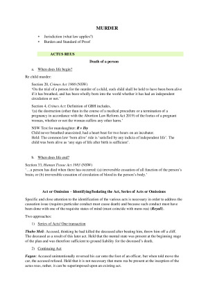 Covered topics: Murder, manslaughter, assault, complicity, defences, and property offences. Includes all relevant cases, rules and necessary legislation in order to determine liability. Can be used during the exam to ensure all issues have been covered for a certain topic.