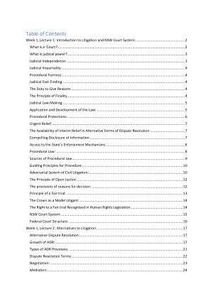 Topics Covered (10 Weeks): - Introduction to Litigation and NSW Court System - Alternatives to Litigation - Mediation in Practice - Arbitration - Legal Technology During the Pandemic - Court-Annexed mediation and ADR - Case Management - Costs - Security for Costs and Funding Litigation - Limitation Periods and Freezing and Search Orders - Pleadings - Standing, Res Judicata, Anshun Estoppel, Causes of Action, Class Actions - Client Legal Privilege - Service - Discovery - Subpoenas, Witness Preparation and Affidavits - Summary Disposal, Appeal, Enforcement and Execution of Judgment