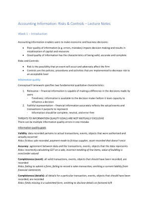 Detailed and extremely helpful notes that will help you achieve an H1 mark for AIRCON. Topics (Week 1 - 11): - Introduction to Accounting Information, Risks and Controls - The Data Processing Cycle - Business Processes Documentation - Risks and Controls Part I - Risks and Controls Part II - Control Analysis Framework - Revenue Cycle - Expenditure Cycle - Conversion Cycle - Financial Reporting Cycle - Ethics of Data & Robotic Process Automation