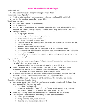 These notes were created from the lectures for the following modules. Module One: Introduction to Human Rights Module Two - Human Rights Law in QLD Module Three: Human Rights in Australian Jurisdictions Module Four - Unlawful Discrimination: Direct and Indirect Module Five - Protected Attributes I: Race, Ethnicity and Religion Module Six - Protected Attributes II: Sex, Pregnancy, Family Responsibilities and Sexuality Module Seven - Protected Attributes III: Disability & Age Module Eight - Protected Areas of Activity Module Eight (pt 2) - Exemptions, Exceptions and Defences Module Nine - Sexual Harassment and Anti-Vilification Module Ten - Complaint Procedures and Remedies For the exam I used only these notes and ended up with 52/60.