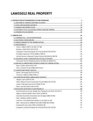 This document contains all topics and case summaries within the Real Property course, and is all you will need during any exam or assessment. This is a content heavy subject, and I spent hundreds of hours compiling and summarising the cases (into facts, reasoning and principle), and explaining the effect of the legislation. I did very well in this subject, and you will need absolutely nothing more.