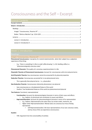Hey! Thanks for checking out my notes. If you decide to purchase them, I trust they'll be very useful to you in this subject and will also help you with writing your assignments. I found this subject really enjoyable and it definitely made me think deeply about my beliefs surrounding the nature of consciousness, free will, and selfhood. I received a mark of 95 for this subject, which was the top mark received out of my cohort. My grades across all subjects average within the top 1% of my cohort and my WAM is 90. The table of contents for these notes is as follows: Week 1: Introduction - Readings x2, lectures x2 Week 2: The Hard Problem - Readings x2, lecture Week 3: The Science of Consciousness - Readings x2, lecture Week 4: Predictive Processing - Readings x2, lectures x2 Week 5: The Unconscious Mind - Readings x3, lectures x3 Week 6: Theories of Self - Readings x3, lectures x3 Week 7: Embodied and Distributed Selves - Reading, lectures x3 Week 8: Disruption of the Self - Readings x2, lecture Week 9: Agency and Free Will - Reading, lecture Week 10: Mind Reading - Reading, lecture x2 Week 11: Evolution of Selves and Consciousness - Reading, lectures x2 Week 12: Animal Sense of Self and Consciousness - Reading x2, lecture