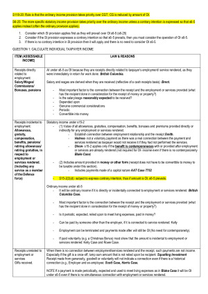 These notes cover every topic taught in the Income Tax Law 3521 course and the COMMLAW 3500 equivalent. The notes are set out in the same format as the exam, making them incredibly valuable during the exam. I got a HD in the exam and in the mid-semester test by using these notes. Topics include: 1. Calculating income tax liability 2. International tax 3. Assessable income- Ordinary Income 4. Assessable income- Statutory Income 5. Capital gains and losses 6. Non-Assessable Income 7. Deductions- General Deductions 8. Deductions- Specific Deductions 9. Tax Accounting 10. Tax Entities