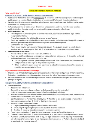 Excellent and detailed notes for the entire course Topics: Key Themes in Australian Public Law Constitutional History – Colonial Origins and Steps to Independence The People and the Constitution A Representative Government A Responsible Executive Non-statutory Executive Powers Oversight of the Executive Safeguards for Judicial Power