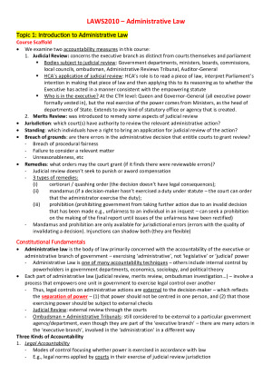 Excellent, very detailed notes for the course Topics Introduction to Administrative Law Merits Review Judicial Review – Jurisdiction of the Courts Standing [Access to Judicial Review] Judicial Review of Rule-making Procedural Fairness Considerations, purposes, policies and representations Unreasonableness Errors of Law and Fact Jurisdictional Error and Invalidity Judicial Review Remedies Breach of Statutory Duty to Give Reasons [Case Study] Privative Clauses [Statutory Attempts to Exclude and Restrict Judicial Review]