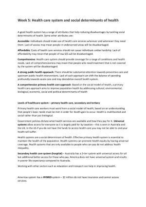 Notes taken for PHE101 Social Determinants of Health Notes cover lecture topics and revision questions I've made up to ensure covering key learning objectives that may be assessed. Content covers: - Health as a social construct - Health and culture - Health and media - Health and employment - Health and education - Health care system - Global scale of health - Health through the life course - Health and stigma / discrimination - Health and social justice - Health and gender - Health and the living environemnt - Health and the economy