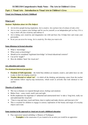 Comprehensive and detailed notes that incorporate all lecture and tutorial content. These notes are colour coded based on which topic it falls under and will be all you need to successfully pass your unit! Topics covered (all lectures is covered and definitions/terms are provided): Module 1: Visual Arts – Introduction to Visual Arts in Children’s Lives – Graphic Languages & Symbolic Meaning Making – Visual Arts – Fostering Children’s Creativity in Visual Arts – Connecting with Artists and Artworks Module 2: Drama – What is Drama? – Drama in Primary School/ Children and Adults playing roles – Pretexts for Drama – Devising and Appreciating Drama with and for Children Module 3: Music & Dance – Music & Dance in Children’s Lives – Music – Singing with Young Children – Approaching Dance