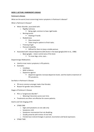 These notes include all lectures for the semester as well as the readings and tutorial notes. - very detailed notes - clearly set out Topics Included: - Parkinson's Disease - Alzheimer's Disease - Post Traumatic Stress Disorder (PTSD) - Substance Use Disorders - Schizophrenia - Sleep Function and Dysfunction - Depression - Psychiatric and Neurological Disorders - Pharmacological Interventions - Behavioural Interventions
