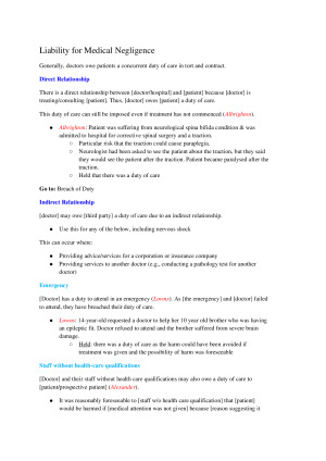 These notes were used to achieve a HD in the exam. The document includes a script for the exam and collates information from lectures, lecture problems and past exams. Good Luck! :) 1. Ethics 2. Health Professional Duties 3. Privacy & Confidentiality 4. Consent & Refusal of Treatment 5. Medical Treatment for Children 6. Medical Treatment for Disabled Adults 7. Medical Negligence 8. Harms to Women 9. Ending Life