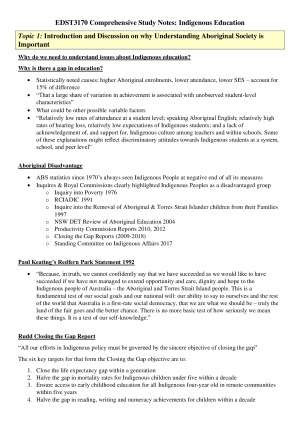 Comprehensive and detailed notes that incorporate all lecture and tutorial content. These notes are colour coded based on which topic it falls under and will be all you need to successfully pass your unit! Topics covered (all lectures is covered and definitions/terms are provided): - Co-existence histories between Aboriginal and non-Aboriginal communities - Understanding and engaging with Aboriginal pedagogical practices - What does Aboriginal pedagogical theory look like in a classroom - Engaging with the Aboriginal community and Aboriginal education workers - Understanding the NSW DoE Aboriginal Education Policy - Embedding Aboriginal perspectives and cultural understandings in your curriculum - Understanding of unconscious bias - Examining racism, the importance of a culturally safe classroom