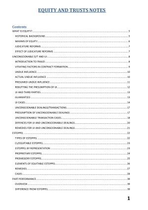 High Distinction Equity notes, covering ALL topics, including key cases and legislation. Achieved a HD (85%) in Equity (LAWS2385) using these notes in-class and for the exam. Latest content complied from the textbook, classes and lectures. All topic including: • Introduction • Unconscionable Conduct and Undue Influence • Equitable rights and equitable titles • Fiduciary obligations • Equitable Estoppel including Remedial Equity • Equitable Assignment of Property • Trusts • Trustee duties, powers and rights and beneficiary rights • Constitution of a Trust • Express Trusts • Charitable Trusts • Resulting Trusts • Constructive Trusts • Personal liability of accessories, recipients, third parties / Barnes v Addy • Tracing • Remedies and bars to relief
