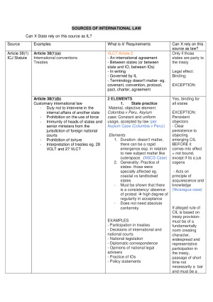 Comprehensive notes including pinpoint referencing. Includes essay prep from additional reading in the textbook. Topics include: Introduction and Sources Treaties International Law and Domestic Law Legal Personality Statehood Recognition Title to Territory Jurisdiction Immunity State Responsibility Use of Force International Dispute Settlement INCLUDES: - PQ extending to all topics - Essay prep includes topics such as state sovereignty, ICJ power, Humanitarian law, Effects Doctrine etc. - Mid Sem case notes and summaries