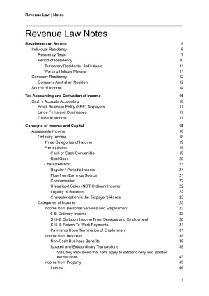 Concise summary of examinable content. Includes a table of contents to easily find topics in the exam (open book). Very simple summary of content, easy to follow, lots of tables. Cases and legislation are colour coded. Contains everything necessary to nail the exam - these notes got me an HD! Plus the exam is open book and class participation is required aso easy to navigate notes are a necessity.