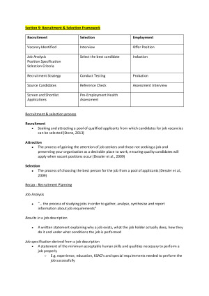 Comprehensive notes that cover all definitions and critical theories for individual quizzes, group assignments and the exam. Key theories are explained through examples and case studies. Notes layout is easy to follow and navigate, as each section and subsection is clearly labelled. CONTENTS: Part One “Make” (Train) Topics: 1. Introduction & Strategic Staffing 2. Learning in Organisations 3. Adult Learning 4. Needs Assessment 5. Designing Training 6. Transfer of Learning 7. Evaluation Part Two “Buy” (Recruit & Select) Topics: 8. Overview of Recruitment & Selection 9. Developing Selection Criteria 10. Sourcing & Attracting Candidates 11. Selection 12. Screening Applicants 13. Psychometric & Other Tests 14. Interview Process & Preparation 15. Behavioural Interviews 16. Reference Checking 17. Employment Legislation 18. Offers & Contracts