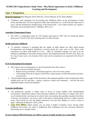 Comprehensive and detailed notes that incorporate all lecture and tutorial content. These notes are colour coded based on which topic it falls under and will be all you need to successfully pass your unit! Topics covered (all lectures is covered, definitions/terms are provided and detailed information tables): - Perspectives - Inquiry - Games - Materials - Outdoor Play - Play in Diverse Contexts - Extending and Enhancing Play - Play and Technology - Imagination - Language - Physical Activity - Social Development