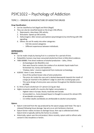 PSYC1022 - Psychology of Addiction Mark - HD Lecture notes from weeks 1 to 10 Topics covered in notes include: - Origins and Manufacture of Addictive Drugs - Manufacture, distribution, prevalence and black market - Population entry and exit from drug taking - Harms of Drug Use - Associative Learning - Neuropharmacology - Withdrawal & Tolerance - Positive reinforcement, craving and economic choice - Biological mechanisms of reward - Cognitive Impairments and comorbidity - Brain mechanisms of impaired behavioural control - Individual differences in vulnerability - Behavioural Interventions - Pharmacotherapy - Prevention and Prohibition