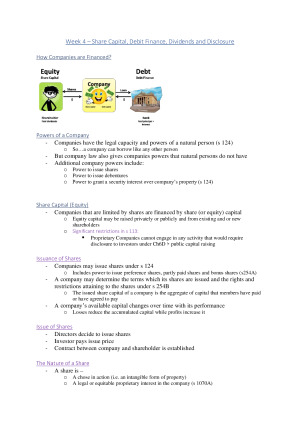 The following topics are included: 1. Introduction to Corporations 2. Business Structure/Types of Companies 3. Constitutional and RR/Directors and Corporate DM 4. Share Capital/Disclosure/Debt Finance and Dividends 5. Corporate Contracting 6. Director Duties (DD) NB: The notes also contain helpful diagrams and tables to explain difficult concepts.