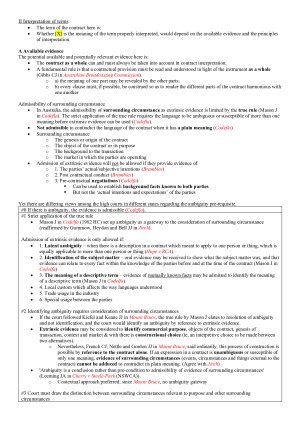 This note is designed to be comprehensive yet easily-extractable for exam use. It is construed in hypo format. Case summaries with material facts are also provided (see sample). Topics included: 1. Terms - Incorporation of terms - Interpretation of terms - Implied terms 2. Consumer Protection - Unfair contract term - Consumer guarantee 3. Termination - Frustration - Non-fulfilment of a condition - Breach 4. Vitiating factors - Common mistake - Unilateral mistake - Duress - Undue influence - Unconscionable dealing - Unconscionable conduct - Third party misconduct - Illegality