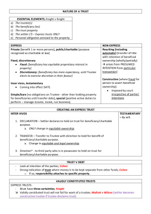 Notes for trusts topics: NATURE OF A TRUST, CERTAINTY OF INTENTION, CERTAINTY OF OBJECT, CERTAINTY OF SUBJECT, COMPLETE CONSTITUTION, FORMALITIES, CHARITABLE TRUSTS, NON-CHARITABLE PURPOSE TRUSTS, TRUSTEE DUTIES, REMEDIES, FIDUCIARY DUTIES