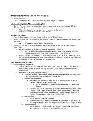 Detailed notes of the entire course NOT an exam summary. Scored a 85+ in the course overall. Includes: Introduction to Taxation and Concepts of Income Personal services income Business income Property income General deductions CGT Trusts Anti-avoidance measures Residency and source
