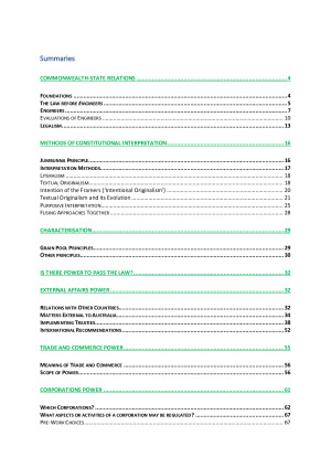 - Topics include: characterisation, external affairs power, corporations power, freedom of interstate trade and commerce, judicial power and detention + more - Detailed case analysis across all topics - Structured to assist with the completion of problem questions across all topics - Incorporates notes on key essay topics - Covers 10 weeks of readings and lectures