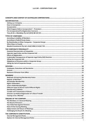 Full notes (124 pages) - including the following topics: 1. Concepts & Context of Australian Corporations 2. Incorporation 3. Types of Companies 4. The Corporate Personality 5. Officers 6. Members 7. Organs of the Company 8. The Corporate Constitution 9. Enforcement of a Company's Constitution 10. Alteration of a Company's Constitution 11. Contracting with the Company 12. Corporate Governance Best Practice 13. Director's Duties - Duty to Act in Good Faith & Exercise Powers for a Proper Purpose, Duty to Avoid Conflicts, Duty to Act with Care and Diligence, Duty to Avoid Insolvent Trading 14. The Civil Penalty Regime 15. Risk Taking and Defences to Breaches of Duty 16. Share Capital 17. Member's Remedies 18. Corporate Funding and Securities 19. Receivership 20. Voluntary Administration 21. Liquidation & Case Notes for the Following: 1. Tracy & Ors v Mandalay Pty Ltd 2. Bluebird Investments Pty Ltd v Graf 3. Gambotto v WCP Ltd