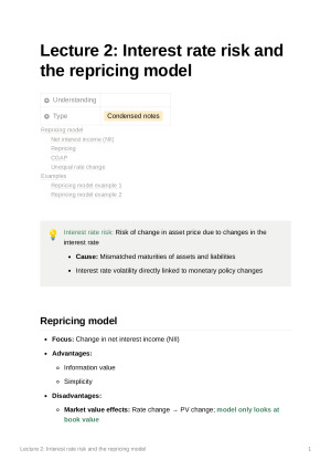 These condensed notes contain the most important information for Management of Financial Intermediaries. Lecture 1: Why are financial institutions special? Lecture 2: Interest rate risk and the repricing model Lecture 3: Interest rate risk and the duration model Lecture 4: Managing interest rate risk using off-balance sheet instruments Lecture 5: Managing interest rate risk using loan sales and securitisation Lecture 6: Credit risk and individual loans Lecture 7: Credit risk and loan portfolios Lecture 8: Off-balance-sheet risk Lecture 9: Bank regulation Lecture 10: Liquidity risk Lecture 11: Liquidity and liability management